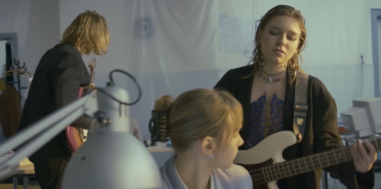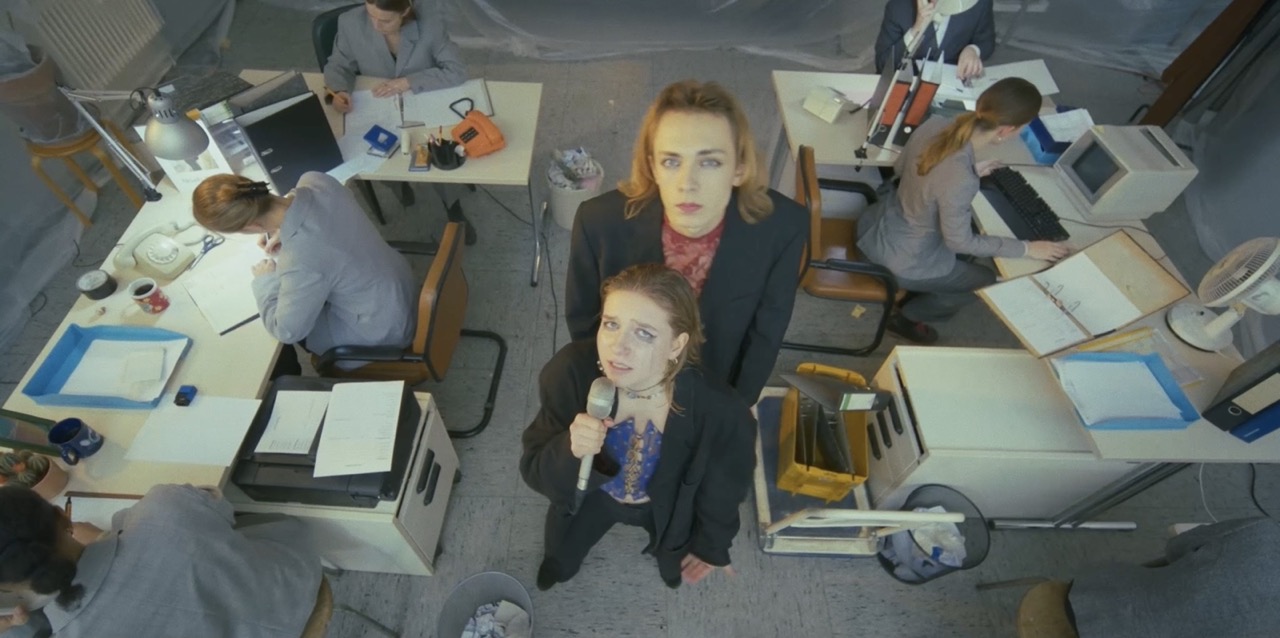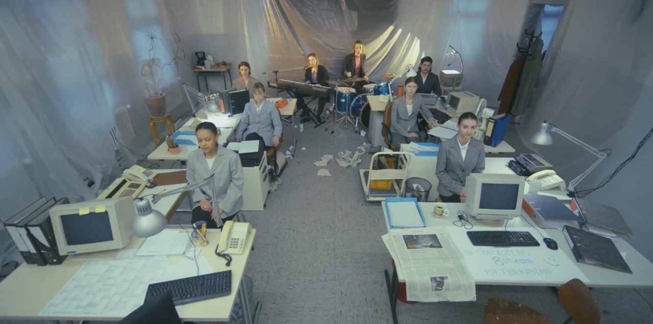 Okapi leben in einer in Plastik eingetüteten und monotonen Welt. Wie gut, dass die beiden ihr Schlagzeug und den Bass auch ins Großraumbüro mitbringen können.